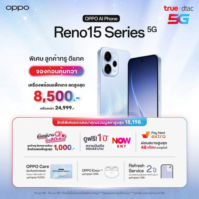 OPPO Reno15 Series 5G เปิดตัวจับมือทรู-ดีแทค จัดโปรจองก่อนลดสูงสุด 8,500 บาท เริ่ม 7,499 บาท พร้อมแพ็กเกจ