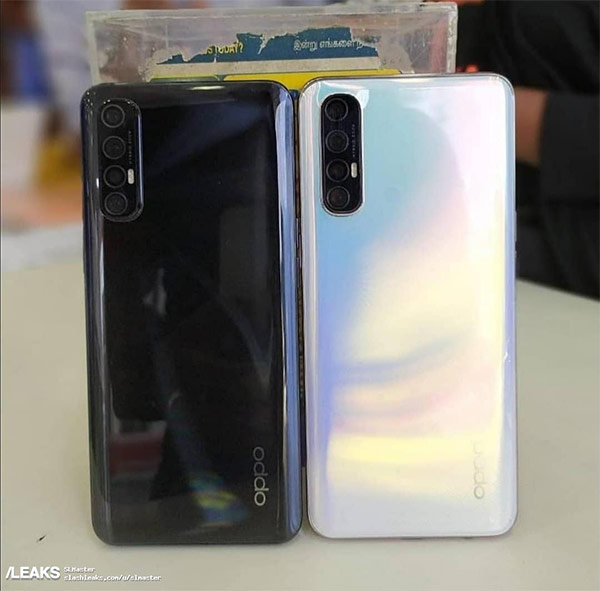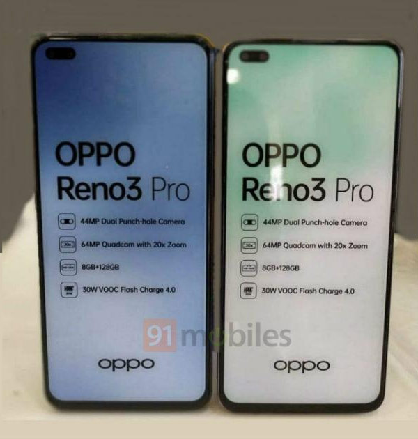 ภาพในครั้งนี้ OPPO Reno3 Pro มาในดีไซน์จอไร้ขอบเจาะรูกล้องหน้าคู่ที่มุมบนซ้าย พร้อมกล้องหลังทั้งหมด 4 ตัว (Quad Camera) บนตัวเครื่องไล่เฉด โดยมีการประทับตราโลโก้ OPPO ที่ด้านล่างชัดเจน นอกจากนี้ยังมีการระบุถึงฟีเจอร์เด่นบางส่วน ได้แก่