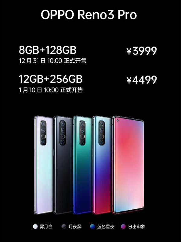 OPPO Reno 3 และ Reno3 Pro จะเริ่มวางจำหน่ายในประเทศจีนตั้งแต่วันที่ 31 ธันวาคมนี้เป็นต้นไป โดยมีรายละเอียดราคาดังนี้