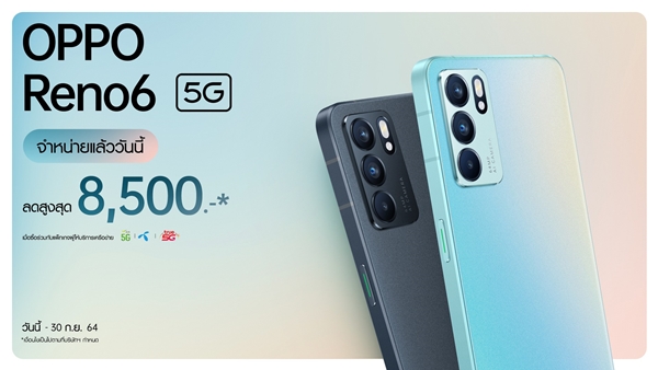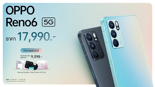 OPPO Reno6 5G เปิดราคาวางจำหน่ายในไทยที่ 17,990 บาท เริ่มวางจำหน่ายแล้ววันนี้ พร้อมโปรโมชันพิเศษสำหรับผู้ที่สั่งซื้อ OPPO Reno6 5G ตั้งแต่วันที่ 17 ก.ย. - 17 ต.ค. 2564 จะได้รับของสมนาคุณมูลค่ารวมกว่า 9,398 บาท ประกอบไปด้วย ลำโพงบลูทูธ Bluetooth Speaker, เครื่องชั่งน้ำหนักอัจฉริยะ Smart Scale และ E-VIP Card พร้อมโปรโมชันพิเศษจากผู้ให้บริการเครือข่าย รับส่วนลดสูงสุด 8,500 บาท เมื่อซื้อเครื่องพร้อมสมัครแพ็กเกจตามที่กำหนด