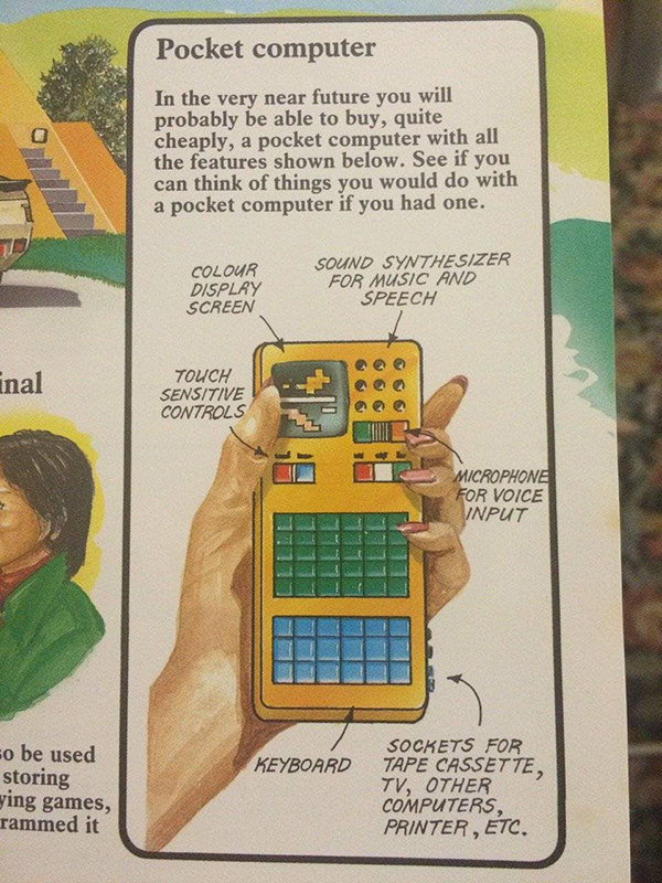 เมื่อเร็ว ๆ นี้ ภาพวาด “คอมพิวเตอร์พกพา” (Pocket Computer) ถูกแชร์บนโลกอินเทอร์เน็ต โดยเป็นภาพวาดเครื่องคอมพิวเตอร์ที่มีลักษณะเป็นแท่งสี่เหลี่ยมขนาดพอดีมือ ด้านล่างมีแผงคีย์บอร์ดสำหรับป้อนข้อมูล ที่มุมซ้ายบนมีจอแสดงผลเล็ก ๆ ส่วนมุมขวามีช่องลำโพงสำหรับเล่นเพลงและสังเคราะห์เสียงพูด พร้อมกันนี้ยังมีไมโครโฟน และปุ่มควบคุมแบบสัมผัส แถมด้านล่างยังมีซ็อกเก็ตสำหรับเชื่อมต่อกับเทปคาสเซ็ต, ทีวี, คอมพิวเตอร์เครื่องอื่น และเครื่องพิมพ์ เป็นต้น พร้อมด้วยข้อความกำกับว่า :