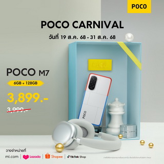 - POCO M7 รุ่นความจุ 6GB + 128GB วางจำหน่ายในราคาพิเศษเพียง 3,899 บาท (จากราคาปกติ 3,999 บาท) ที่ mi.com และช่องทางการจัดจำหน่ายทางออนไลน์แพลตฟอร์ม Lazada, Shopee และ TikTok Shop3