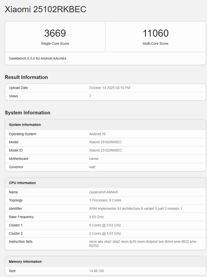 เว็บไซต์ IT Home รายงานว่า POCO F8 Ultra หรือที่รู้จักในชื่อ Redmi K90 Pro ถูกพบในฐานข้อมูลของ Geekbench โดยมีหมายเลขรุ่น 25102RKBEC ซึ่งสามารถทำคะแนนได้สูงถึง 3559 คะแนน (Single-core) และ 11060 คะแนน (Multi-core) บน Geekbench 6.5.0 ถือเป็นหนึ่งในสมาร์ตโฟน Android ที่ทำคะแนนได้สูงที่สุดในปัจจุบัน และมีแนวโน้มจะกลายเป็นหนึ่งในรุ่นที่ทรงพลังที่สุดของปีนี้ นอกจากนี้ยังมีการเปรียบเทียบกับรุ่นระดับเรือธงอื่น ๆ เช่น Xiaomi 15 Pro และ Redmi K80 Ultra ซึ่งใช้ชิปและระบบกล้องในระดับใกล้เคียงกัน