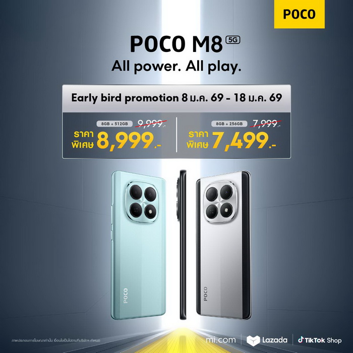 - POCO M8 5G รุ่นความจุ 8GB+512GB วางจำหน่ายในราคาพิเศษ 8,999 บาท26 (จากราคาปกติ 9,999 บาท)