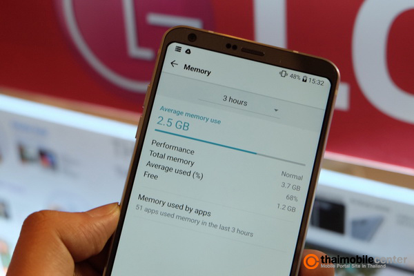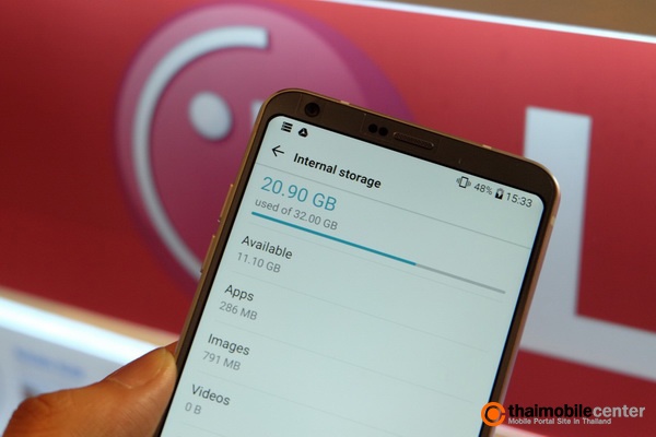 สำหรับหน่วยความจำภายใน (ROM) ของ LG G6 ตัวที่วางจำหน่ายจริงจะมีความจุ 64GB โดยในภาพเป็นเพียงเครื่องตัวโชว์เท่านั้น