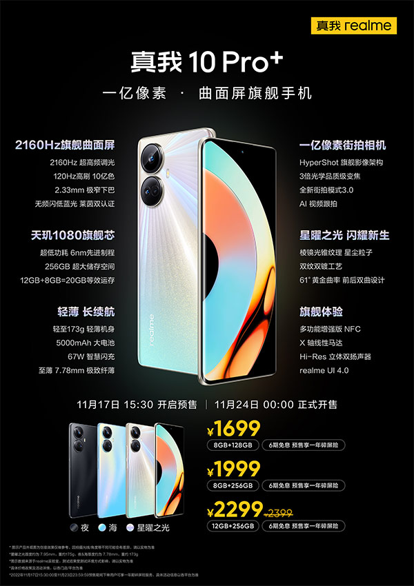 realme 10 Pro Series มีตัวเลือก 3 สีเหมือนกัน ได้แก่ สีดำ, สีฟ้า และสีทองไล่เฉด โดยจะเริ่มวางจำหน่ายในประเทศจีนวันที่ 24 พฤศจิกายนนี้เป็นต้นไป