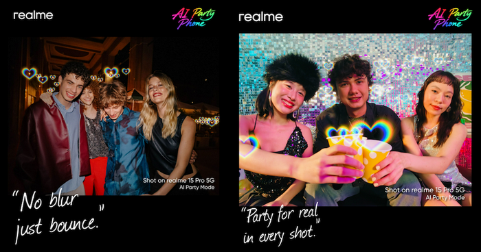 AI Party Mode ถือเป็นนวัตกรรมแรกของวงการ ที่ทำให้ realme 15 Series 5G สามารถถ่ายภาพบุคคลได้อย่างชัดเจนและสว่างสดใสในสภาพแสงน้อย โหมดนี้ยังอัดแน่นไปด้วยลายน้ำสุดสร้างสรรค์และกรอบรูปหลากสีสันหลายสไตล์ นอกจากนี้ AI MagicGlow 2.0 ยังช่วยให้ภาพถ่ายบุคคลดูสมจริงด้วยโทนสีผิวที่เป็นธรรมชาติ รายละเอียดที่ชัดเจน และมิติ แสงเงาที่สมจริง ในขณะที่ฟิลเตอร์เอ็ฟเฟ็กต์คู่ยังช่วยเพิ่มประกายพิเศษให้กับทุกช็อต