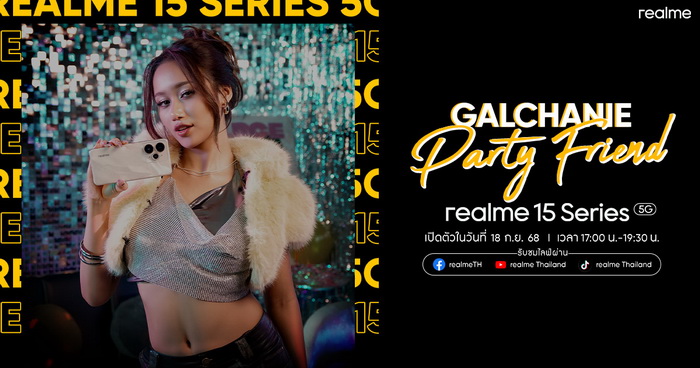 realme (เรียลมี) เตรียมสร้างปรากฏการณ์ความสนุกครั้งยิ่งใหญ่ในงานเปิดตัว “realme 15 Series 5G” สมาร์ตโฟนรุ่นล่าสุดจากตระกูล Number Series ที่มาพร้อม กล้อง Ultra-Clear Triple 50MP ยกระดับการถ่ายภาพคมชัดทุกรายละเอียด พร้อมอัดแน่นด้วยฟีเจอร์เด่นอย่าง AI Party Mode เติมเต็มไลฟ์สไตล์ทั้งสายถ่ายภาพ สายคอนเทนต์ และสายปาร์ตี้ตัวจริง งานนี้ยังได้ศิลปินสาวสุดฮอต GALCHANIE – “แกลชานี” ธนัญญา อินวงษ์ มาร่วมเป็นแขกรับเชิญพิเศษในบทบาท “realme Party Friend” ส่งต่อพลังบวกแห่งความสนุก แชร์มุมมองการใช้ชีวิตสไตล์ปาร์ตี้เกิร์ล และชวนแฟน ๆ สัมผัสประสบการณ์เอ็กซ์คลูซีฟไปด้วยกัน