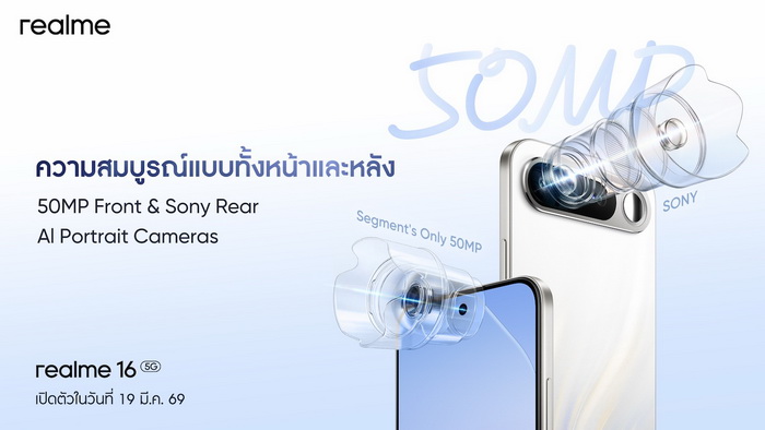 เตรียมสัมผัสความงามของ Aurora Wings Design แบบเต็มตา พร้อมฟีเจอร์ระดับแฟล็กชิปอีกมากมายของ “realme 16 5G” และ realme 16 Pro 5G, realme 16 Pro 5G และผลิตภัณฑ์ IOT อาทิ realme Buds T500 Pro และ realme Pad 3 ในงานเปิดตัวอย่างเป็นทางการ วันที่ 19 มีนาคม 2569 สามารถรับชมการถ่ายทอดสดในทุกแพลตฟอร์มทั้ง Facebook, YouTube และ TikTok ของ realme Thailand ตั้งแต่เวลา 16.00 น. เป็นต้นไป – รอติดตามกันได้เลย!