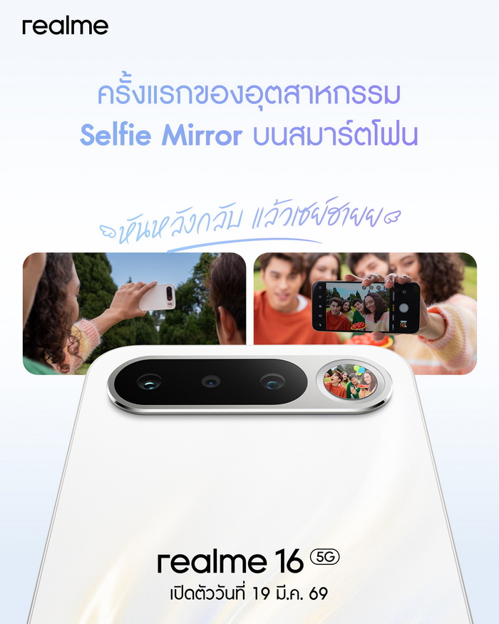 realme 16 5G ชูดีไซน์ “Camera Bar” พร้อม Selfie Mirror ครั้งแรกในอุตสาหกรรม ถ่ายเซลฟีคุณภาพสูง ด้วยเลนส์กล้องที่ดีที่สุด