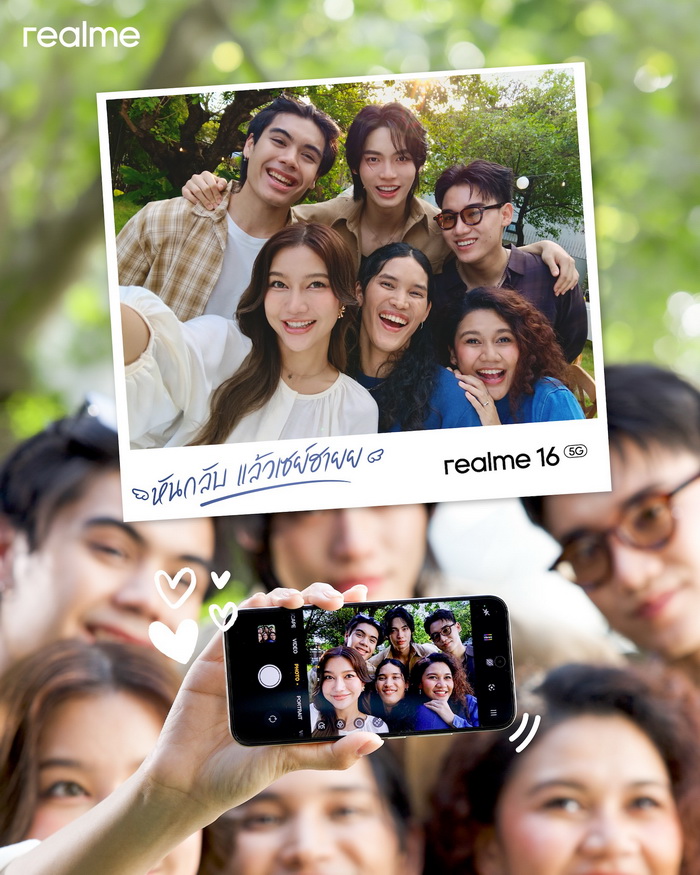 หนึ่งในไฮไลต์ของ realme 16 5G series คือดีไซน์ Camera Bar ระดับแฟลกชิป ซึ่งวางตำแหน่งไว้อย่างสมมาตรให้กลมกลืนไปกับฝาหลังอย่างลงตัว แต่สิ่งที่พิเศษกว่ามือถือรุ่นอื่น ๆ คือ “Selfie Mirror” กระจกถ่ายเซลฟีที่ฝังอยู่ในโมดูลกล้องหลังเป็นครั้งแรกของวงการสมาร์ตโฟน! ช่วยให้ผู้ใช้สามารถเช็คเสื้อผ้า หน้าผม ท่าโพส และจัดเฟรมให้สวยตรงใจก่อนกดชัตเตอร์ ซึ่งเมื่อสามารถถ่ายเซลฟีได้ด้วยกล้องหลัก ก็จะได้ภาพความละเอียดสูงที่คมชัดพร้อมการทำงานของเซนเซอร์ภาพที่ดีที่สุดในกล้องมือถือ เปิดประสบการณ์การถ่ายเซลฟีแบบใหม่ที่สวยงามเป็นธรรมชาติมากขึ้น ไม่ว่าจะถ่ายเดี่ยวในท่าโพสต์ปัง ๆ หรือถ่ายหมู่เพื่อแชร์โมเมนต์สุดประทับใจ ก็สวยคมชัดได้ทุกช็อต