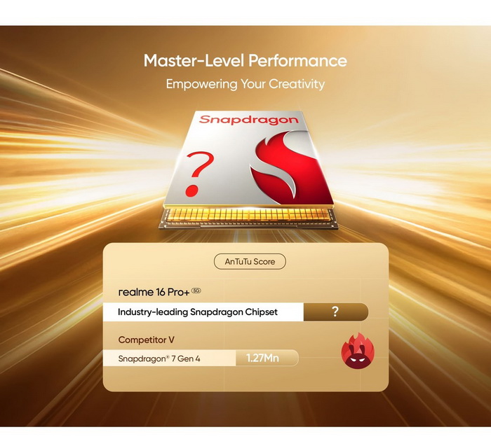 ต่อมาคือชิปประมวลผลของ realme 16 Pro ที่ยืนยันแล้วว่าจะใช้ชิปตระกูล Snapdragon โดยปกติสมาร์ตโฟนซีรีส์นี้มักได้ชิป Snapdragon 7-series แต่ทีเซอร์ล่าสุดระบุว่ารุ่นใหม่นี้จะใช้ชิปที่มีประสิทธิภาพสูงกว่า Snapdragon 7 Gen 4 ซึ่งเป็นชิปของ realme 15 Pro อย่างไรก็ตาม ขณะนี้ยังไม่มีทั้ง Snapdragon 7 Gen 5 หรือ 7+ Gen 4 ทำให้ยังต้องรอลุ้นกันว่าชิป Snapdragon รุ่นใดจะถูกเลือกมาใช้จริง
