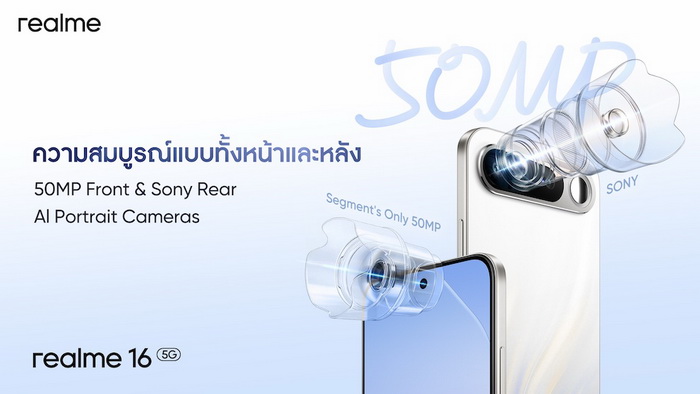 realme 16 5G มาพร้อมระบบกล้องคู่ AI Portrait Master 50MP ทั้งกล้องหน้าและหลัง โดยกล้องหลังใช้เซ็นเซอร์ Sony IMX852 ขนาด 1/2.93 นิ้ว รูรับแสง F1.8 ให้ภาพคมชัดแม้ในแสงน้อย ส่วนไฮไลต์ที่ทำให้หลายคนสนใจคือ Selfie Mirror (กระจกเซลฟี่ด้านหลัง) ครั้งแรกในอุตสาหกรรม ช่วยให้จัดเฟรมภาพได้แม่นยำแบบเรียลไทม์เมื่อต้องการถ่ายด้วยกล้องหลัก เสริมด้วย Aura Ring Flash เพื่อให้ความสว่างที่สม่ำเสมอและระบบจดจำท่าทาง “Say Hi” ที่ใช้กดชัตเตอร์ถายภาพได้เลย โดยยังคงมาพร้อมเทคโนโลยี LumaColor Engine ช่วยจัดการสีสันอย่างแม่นยำและเป็นธรรมชาติ รวมถึง Vibe Master Mode, AI Edit Genie และ AI Instant Clip ก็ยังให้มาครบ พร้อมเติมเต็มจินตนาการของสายครีเอเตอร์รุ่นใหม่ได้ในทุกสถานการณ์