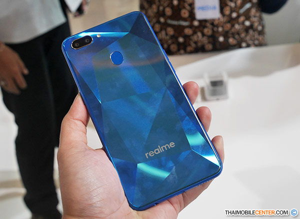 ด้านหลังของตัวเครื่องดีไซน์คล้ายเพชร และมีความเงางาม โดยจะมีกล้องคู่ (Dual Camera) อยู่ที่ด้านบน และเซ็นเซอร์สแกนลายนิ้วมือที่ตรงกลาง รวมถึงโลโก้ Realme ที่ด้านล่าง