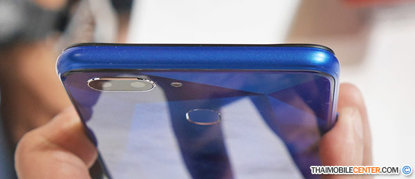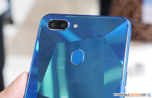 ดีไซน์ด้านหลังเงางามด้วยเทคโนโลยีเคลือบ 15 ชั้นแบบ Laminated Tech ที่สวยพรีเมียมมากยิ่งขึ้น ซึ่งจะมีกล้องคู่ (Dual Camera) และเซ็นเซอร์สแกนลายนิ้วมือ พร้อมด้วยโลโก้ Realme