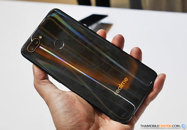 ตัวเครื่องด้านหลังมีการดีไซน์เงางามแบบ Unibody Glossy และระบบกล้องคู่ (AI Dual Camera) พร้อมโลโก้ Realme