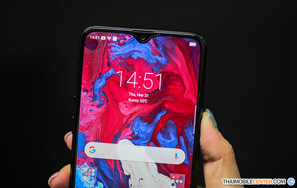 - หน้าจอแสดงผล Dewdrop Display ขนาด 6.2 นิ้ว ในอัตราส่วน 19:9 ความละเอียดระดับ HD+ (720x1520 พิกเซล : สัดส่วนการแสดงผลของหน้าจออยู่ที่ 88.30%) พร้อมครอบทับด้วยกระจกขอบนูนแบบ 2.5D Corning Gorilla Glass 3
