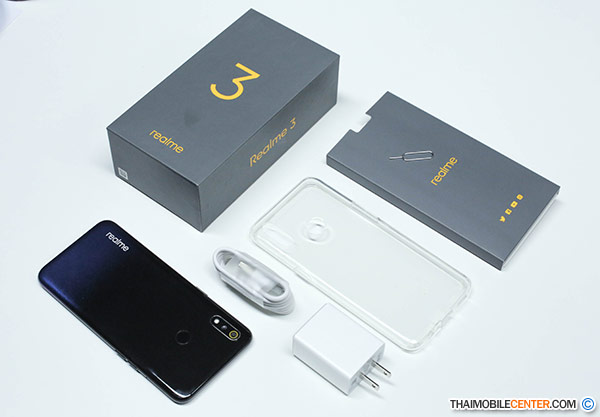 realme 3 มาในแพ็กเกจสีเทา โดยมีตัวอักษรสีเหลือง