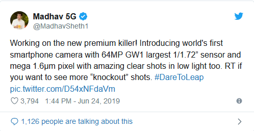 Madhav Sheth CEO ของ Realme ประเทศอินเดีย ได้โพสต์รูปถ่ายรูปหนึ่งบน Twitter ซึ่งมีลายน้ำ "64 MP AI Qaud Camera" และ "Shot on realme" อยู่ที่มุมล่างซ้ายของรูป พร้อมกับเปิดเผยว่า Realme กำลังพัฒนาสมาร์ทโฟนกล้อง 64 ล้านพิกเซลรุ่นแรกของโลก ซึ่งใช้เซ็นเซอร์ ISOCELL Bright GW1 รุ่นล่าสุดของ Samsung ตัวเซ็นเซอร์มีขนาด 1/1.7 นิ้ว และมีขนาดพิกเซล 1.6 ไมครอน แต่ยังไม่ได้เปิดเผยชื่อ และสเปกส่วนอื่นๆ ของสมาร์ทโฟนรุ่นนี้