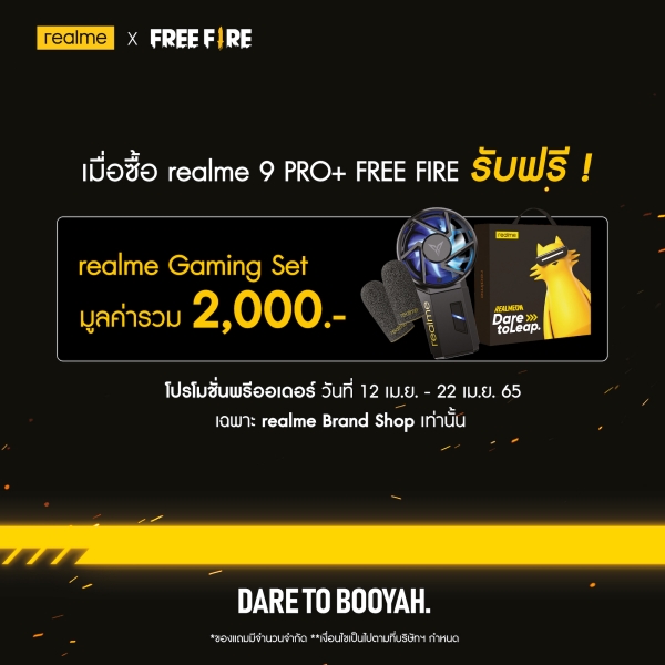 - โปรโมชันพรีออเดอร์ เมื่อสั่งซื้อในวันที่ 12 เมษายน - 22 เมษายน 2565 ผ่าน realme Brand Shop จะได้รับฟรี realme Gaming Set มูลค่ารวม 2,000 บาท