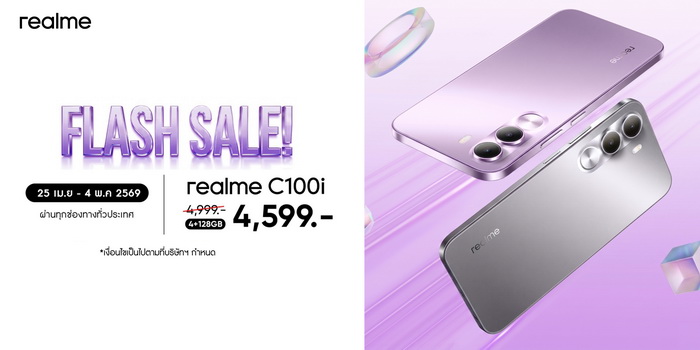 ซัมเมอร์นี้ถ้ายังหาสมาร์ตโฟนคู่ใจสายลุยไม่ได้ บอกเลยว่าดีลนี้ห้ามพลาด! realme (เรียลมี) จัดโปรโมชัน “FLASH SALE” แบบจัดเต็ม ส่ง realme C100i บัดเจ็ตโฟนสุดอึด ความจุ 4/128GB ที่ออกแบบมาเพื่อการใช้งานหนักโดยเฉพาะ ทั้งทนทาน แบตอึด พร้อมลุยได้ทุกสถานการณ์ ไม่ว่าจะฝุ่น ลม หรือแดดแรง