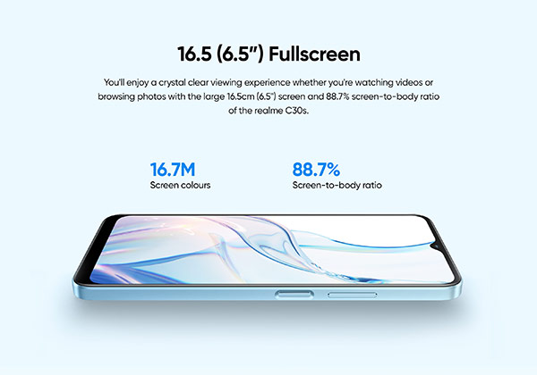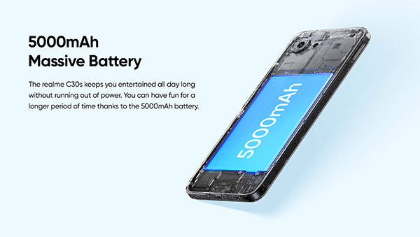 realme C30s ยืนยันชูโรงที่แบตเตอรี่ความจุ 5000 mAh พร้อมหน้าจอไร้ขอบทรงหยดน้ำแบบ Fullscreen ขนาด 6.5 นิ้ว และเซนเซอร์สแกนลายนิ้วมือที่ด้านข้างตัวเครื่อง รวมถึงชิปเซ้ตประมวลผลแบบ Octa-Core ที่มีผลทดสอบจากทาง AnTuTu Benchmark ที่ 106,409 คะแนน