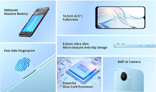 โดยติดตั้งกล้องหลังแบบ AI Camera 8MP ผสานกล้องหน้า 5MP พร้อมมีเซนเซอร์สแกนลายนิ้วมือที่ด้านข้างตัวเครื่อง และประมวลผลด้วยชิปเซ็ต Unisoc SC9863A จับคู่ RAM ขนาดสูงสุด 4GB + ROM ความจุสุงสุด 64GB พร้อมระบบเสียง Dirac 3.0 และมีถาดใส่ซิมการ์ดแบบ Triple-Slot ซึ่งทำงานอยู่บนระบบปฏิบัติการ Android 12 ครอบทับด้วย realme UI Go Edition