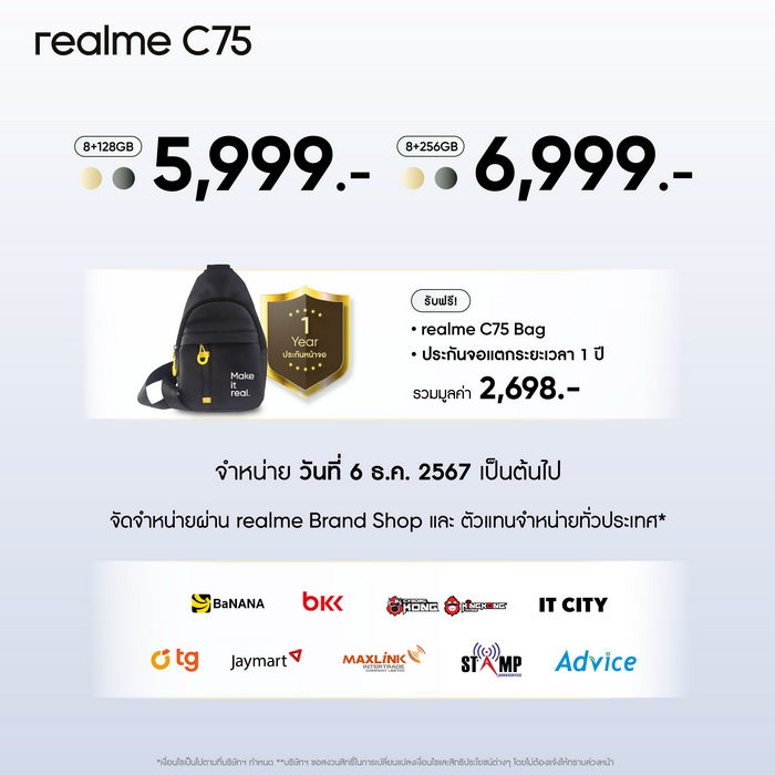 รับของสมนาคุณ realme C75 Bag และประกันจอแตก 1 ปี รวมมูลค่า 2,698 บาท ทั้งช่องทาง realme Brand Shop, BANANA, BKK, CyborgKong, Kingkongphone, IT City, TG, Jaymart, Maxlink, Stamp, Advice และ Singer