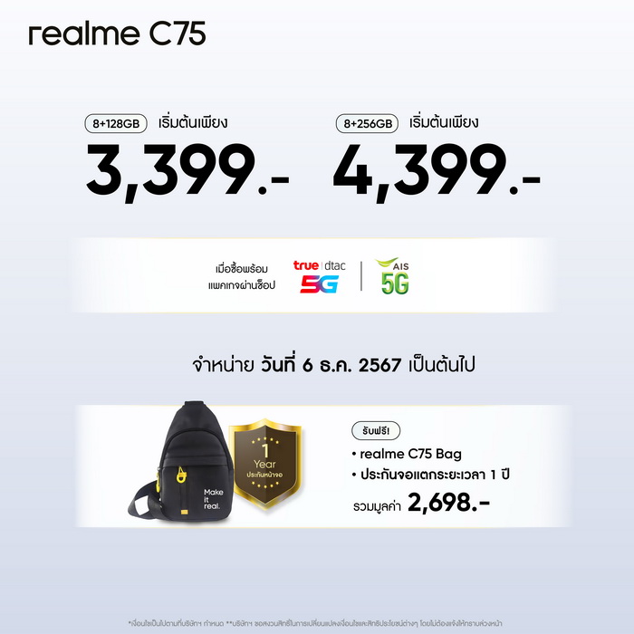 รับฟรี realme C75 Bag และประกันจอแตก 1 ปี รวมมูลค่า 2,698 บาท พร้อมโปรโมชันส่วนลดเพิ่มเติมของแต่ละแพลตฟอร์ม