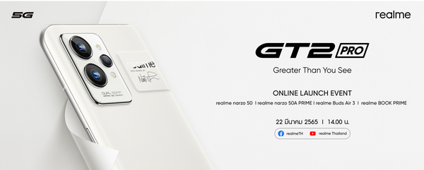 เตรียมสัมผัสประสบการณ์สุดล้ำกับสมาร์ตโฟนระดับเรือธงที่พรีเมียมที่สุดจาก realme ครั้งแรกในไทย กับ realme GT 2 Pro และผลิตภัณฑ์อื่น ๆ ในงานเปิดตัวรูปแบบออนไลน์ วันที่ 22 มีนาคม 2565 ตั้งแต่เวลา 14.00 น. เป็นต้นไป บนแพลตฟอร์มโซเชียลมีเดียอย่างเป็นทางการของทาง realme ได้แก่ YouTube และ Facebook โดยงานนี้ นอกจากคุณจะได้ตื่นตาตื่นใจกับความพรีเมียมที่มอบให้แล้ว ยังมีกิจกรรมพิเศษลุ้นรับรางวัลอีกด้วย แล้วพบกันในงาน!