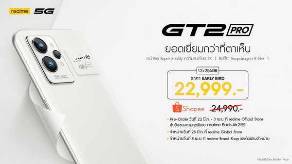 - รอบ Early bird เหลือเพียง 22,999 บาท เฉพาะช่องทาง Shopee ใน realme Official Store เปิดให้พรีออเดอร์ตั้งแต่ 22 มีนาคมถึง 3 เมษายนนี้ พร้อมรับ realme Buds Air 2 Neo จำนวนจำกัด และจำหน่ายวันแรก 4 เมษายนนี้ รวมถึงช่องทาง Shopee ใน realme Official Global store จำหน่ายวันแรกในวันที่ 25 มีนาคมนี้เป็นต้นไป