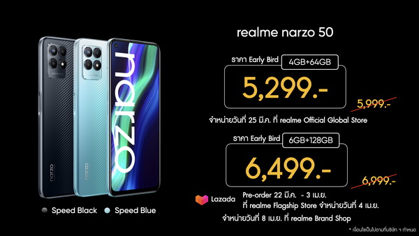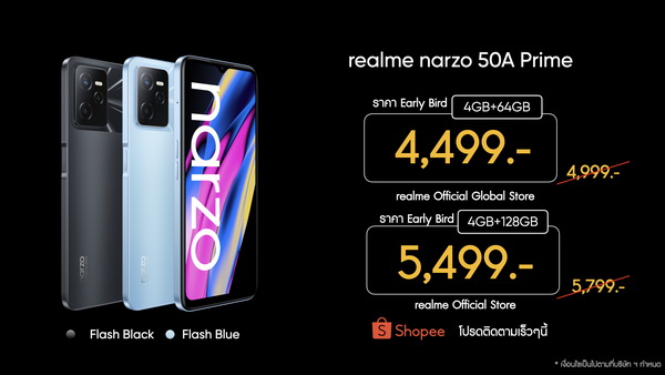 - realme narzo 50A PRIME: 4+64GB ราคา 4,999 บาท ราคา Early Bird เหลือเพียง 4,499 บาท