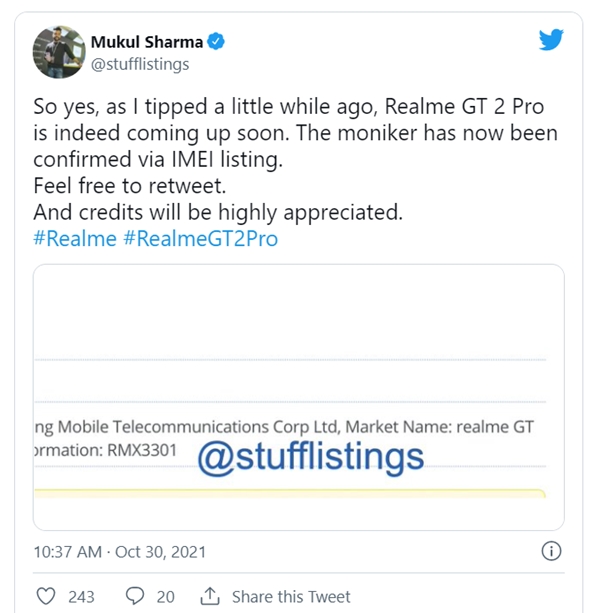 เมื่อไม่นานมานี้ realme GT 2 Pro ได้ไปปรากฏบนฐานข้อมูล IMEI Database ซึ่งเป็นสัญญาณที่ดีว่าสมาร์ทโฟนรุ่นดังกล่าวมีตัวตนอยู่จริง แลจะเปิดตัวให้เห็นในเร็ว ๆ นี้ โดยนส่วนของสเปก ตามรายงานระบุว่า อาจมาพร้อมกับชิปเซ็ต Qualcomm Snapdragon 888 หรืออาจมีลุ้นได้ใช้ชิปเซ็ตตัวใหม่กว่าอย่าง Snapdragon 898 ทำงานคู่กับหน่วยความจำ RAM ขนาด 12GB พร้อมหน่วยความจำภายในความจุ 256GB และแบตเตอรี่ขนาด 4500mAh ที่รองรับระบบชาร์จเร็ว 65W บนหน้าจอแสดงผลแบบ AMOLED ที่มีค่า Refresh Rate ระดับ 120Hz