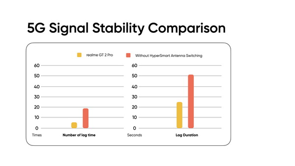 เทคโนโลยีสลับเสาสัญญาณคลื่นย่านอัลตร้าไวด์แบนด์ (HyperSmart) ของ realme ถูกออกแบบให้มีเสาอากาศมากถึง 12 จุด โดยติดตั้งทุกด้านรอบตัวเครื่อง รองรับย่านสัญญาณหลักได้รอบทิศทางและมีประสิทธิภาพการรองรับความแรงของสัญญาณได้เท่ากันทุกจุด ซึ่งทำให้ realme GT 2 Pro สามารถประเมินความแรงสัญญาณของเสาสัญญาณแต่ละจุดได้แบบอัจฉริยะ และทำการเลือกใช้เสาสัญญาณที่มีความแรงสัญญาณสูงสุดได้อัตโนมัติ