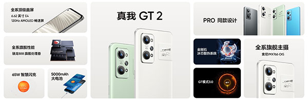 realme GT 2 และ GT 2 Pro มาพร้อมหน้าจอเจาะรูกล้องหน้า บนตัวเครื่องเพรียวบาง น้ำหนักเบา และลวดลายพิเศษที่มีผิวสัมผัสคล้ายกระดาษที่ได้รับการออกแบบโดย Naoto Fukasawa นักออกแบบชื่อดัง สำหรับรุ่น realme GT 2 มากับหน้าจอ 120Hz AMOLED ขนาด 6.62 นิ้ว คมชัดระดับ Full HD+ รองรับค่า Refresh Rate ระดับ 120Hz และประมวลผลชิปเซ็ต Qualcomm Snapdragon 888 จับคู่กับ RAM (LPDDR5) ขนาด 8GB / 12GB + ROM (UFS 3.1) ขนาด 128GB / 256GB โดยมีแบตเตอรี่ความจุ 5000 mAh ที่รองรับเทคโนโลยีชาร์จเร็ว 65W SuperDart Charge สามารถชาร์จจากระดับ 0-100% ได้ภายในเวลา 33 นาที รวมถึงมีกล้องหลัง 3 ตัว ประกอบด้วย กล้องตัวหลัก 50MP เซนเซอร์ Sony IMX766 รองรับ OIS + กล้อง Ultra-Wide ถ่ายภาพมุมกว้าง 119 องศา + กล้อง Macro ถ่ายภาพระยะใกล้สุดที่ 4 เซนติเมตร ผสานกล้องหน้า 16MP และทำงานอยู่บนระบบปฏิบัติการ Android 12 เวอร์ชันล่าสุด ที่ครอบทับด้วย realme UI 3.0