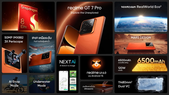 realme เปิดตัวมือถือเรือธงที่ทุกคนรอคอย “realme GT 7 Pro” ใหม่ล่าสุดในธีม Explore the Unexplored โดยเป็นสมาร์ตโฟนเครื่องแรกในไทย ที่ได้ใช้สุดยอดชิปเซ็ตรุ่นใหม่ล่าสุดจากค่าย Qualcomm อย่าง Snapdragon 8 Elite ซึ่งทำให้ “realme GT 7 Pro” เป็นเรือธงที่สร้างมาตรฐานใหม่ทั้งในด้านประสิทธิภาพการใช้งานและการถ่ายภาพขั้นเทพ เพื่อมอบสุดยอดประสบการณ์สมาร์ตโฟนระดับเรือธงให้กับผู้ใช้ในราคาที่จับต้องได้มากขึ้น