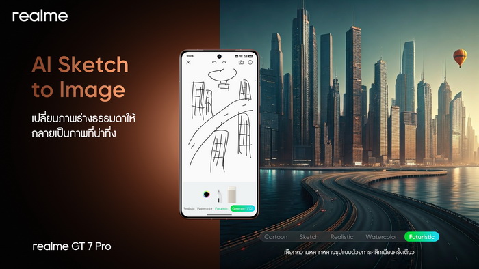 realme GT 7 Pro เป็นสมาร์ตโฟนรุ่นแรกในตลาดไทย ที่ติดตั้งชิปเซ็ต Snapdragon 8 Elite สุดล้ำสมัย โดยเป็นมือถือเรือธง AI รุ่นใหม่ซึ่งจะมาทลายข้อจำกัดของสมาร์ตโฟน AI ในอดีตด้วยฟีเจอร์ AI ขั้นสูงมากมาย โดยมีจุดมุ่งหมายเพื่อปฏิวัติอุตสาหกรรมสมาร์ตโฟนในฐานะ “ม้ามืด AI” คนใหม่ โดย realme GT 7 Pro ผสานการทำงานของ AI ทั้งในการทำงานภาพรวม การประมวลผลภาพ และการเล่นเกมได้อย่างราบรื่น พร้อมด้วยนวัตกรรมอื่น ๆ เช่น AI Sketch to Image เปลี่ยนภาพสเก็ตช์ให้กลายเป็นภาพที่มีรายละเอียดครบถ้วนสวยงาม รวมถึง AI Motion Deblur และ AI Telephoto Ultra Clarity ช่วยปรับภาพให้คมชัดและสวยงามอย่างง่ายดาย และ AI Game Super Resolution ช่วยเพิ่มความละเอียดภาพได้สูงสุดถึง 1.5K เพื่อมอบประสบการณ์การเล่นเกมที่ดื่มด่ำมากยิ่งขึ้น