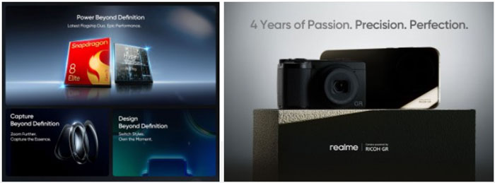realme GT 8 Pro มาพร้อมชิปประมวลผลตัวท็อปรุ่นล่าสุด Snapdragon 8 Elite Gen 5, แบตเตอรี่ขนาดใหญ่ 7,000mAh, และหน้าจอ LTPO AMOLED ขนาด 6.79 นิ้ว ความละเอียด QHD+ รีเฟรชเรต 144Hz นอกจากนี้ยังเป็นสมาร์ตโฟนรุ่นแรกของ realme ที่ใช้ระบบกล้องที่ปรับจูนโดย Ricoh โดยมีกล้องหลัก 50MP, กล้อง Periscope 200MP (ซูมออปติคอล 3x) และกล้อง Ultra-wide 50MP