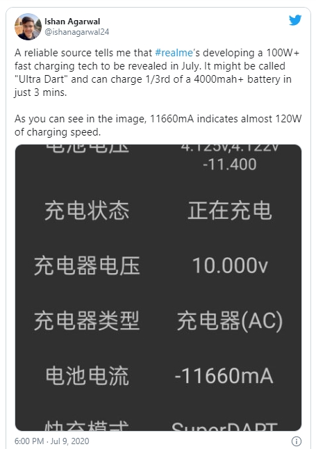 Ishan Agarwal แหล่งข่าวที่มีความน่าเชื่อถือรายหนึ่ง ได้เปิดเผยข้อมูลล่สุดเกี่ยวกับเทคโนโลยีชาร์จเร็วของ realme ให้ได้ทราบกัน โดยระบุว่า realme กำลังพัฒนาระบบชาร์จที่มีกำลังจ่ายไฟสูงกวา่ 100W และจะมีการเปิดตัวให้เห็นภายในเดือนกรกฎาคมนี้ด้วย โดยเบื้องต้นคาดว่าจะใช้ชื่อระบบ Ultra Dart Charge ซึ่งสามารถชาร์จแบตเตอรี่ขนาด 4000mAh ได้ราว 1/3 (ประมาณ 33%) ในเวลาเพียง 3 นาทีเท่านั้น