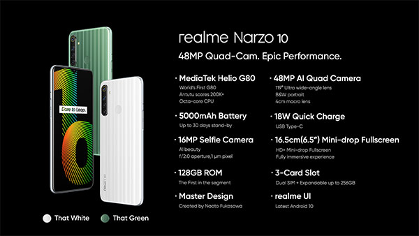 สำหรับ realme Narzo 10 มาในดีไซน์จอไร้ขอบทรงหยดน้ำแบบ Mini-Drop FullScreen ขนาด 6.5 นิ้ว บนตัวเครื่องเงางาม พร้อมลวดลายเส้นตรงโทนสีเข้ม สลับกับสีอ่อน ที่ได้รับการออกแบบจาก Naoto Fukasawa โดยมีการติดตั้งกล้องหลัง 4 ตัว (AI Quad Camera) คมชัดความละเอียด 48 ล้านพิกเซล พร้อมกับใช้งานชิปเซ็ต MediaTek Helio G80 จับคู่กับ RAM 4GB + ROM 128GB มีแบตเตอรี่ความจุ 5000 mAh รองรับเทคโนโลยีชาร์จเร็ว 18W Quick Charge ผ่านพอร์ตการเชื่อมต่อมาตรฐานใหม่อย่าง USB Type-C
