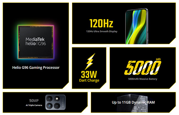 สเปกภายในของ realme narzo 50 ประมวลผลด้วยชิปเซ็ต MediaTek Helio G96 จับคู่ RAM 4GB / 6GB + เทคโนโลยี Dynamic RAM Expansion เพิ่ม RAM เสมือนได้สูงสุด 5GB พร้อม ROM 64GB / 128GB และมีแบตเตอรี่ความจุ 5000 mAh ที่รองรับเทคโนโลยีชาร์จเร็ว 33W Dart Charge