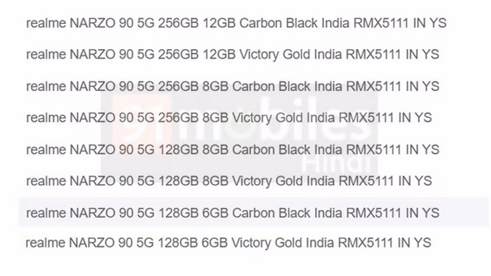 แตกต่างจากรุ่นก่อน คราวนี้ดูเหมือนว่าจะมีรุ่น “วานิลลา” อย่าง realme Narzo 90 เพิ่มเข้ามาด้วย โดยตามรายงานใหม่ระบุว่าเครื่องรุ่นนี้ใช้หมายเลขโมเดล RMX5111 และคาดว่าจะวางจำหน่ายในสี Carbon Black และ Victory Gold พร้อมตัวเลือก RAM 6GB / 8GB / 12GB ซึ่งภาพหลุดที่ปรากฏเป็นสี Victory Gold