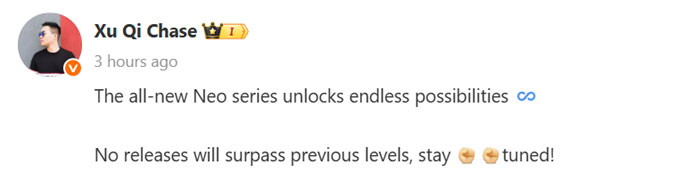 ในโพสต์บน Weibo ล่าสุด Xu Qi รองประธาน realme และหัวหน้าฝ่ายการตลาดระดับโลก ระบุว่าไลน์อัป Neo รุ่นถัดไปจะมาพร้อม “การอัปเกรดที่มีความหมาย” มากกว่าการปรับเล็กน้อย ซึ่งสอดคล้องกับภาพกล่องของ realme Neo 8 Infinite Edition ที่ถูกแชร์บนโซเชียลจีน และเผยให้เห็นว่าอาจมาพร้อมหน้าจอจาก Samsung