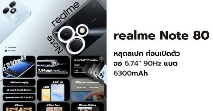 realme Note 80 หลุดสเปก ก่อนเปิดตัว 5 มีนาคม สมาร์ตโฟนจอ 6.74" 90Hz แบต 6300mAh