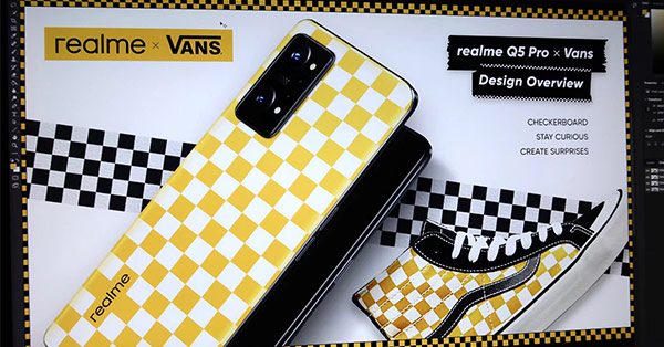 realme Q5 Pro x Vans มาในดีไซน์สุดพิเศษ ด้วยฝาหลังลายตารางหมากรุกสีเหลืองตัดกับสีขาว ที่อิงมาจากรองเท้ารุ่นยอดนิยมของ Vans ซึ่งคาดว่าจะเปิดตัวอย่างเร็วสุดช่วงปลายเดือนนี้ โดยระบุถึงฟีเจอร์เด่นตัวเครื่องไว้ดังนี้