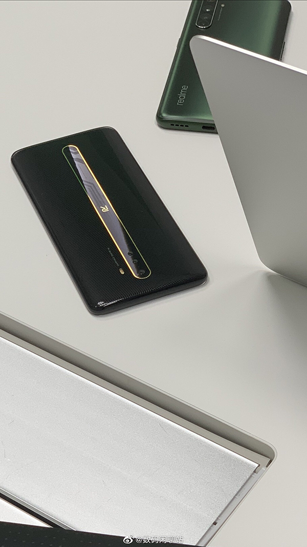 ภาพหลุดชุดนี้ปรากฏบน Weibo โดยแหล่งข่าวหลุด Digital Chat Station เป็นรูปถ่ายของสมาร์ทโฟน realme รุ่นปริศนา ที่มีตัวเครื่องสีดำเงาลายเคฟล่าร์ และมีแถบสีดำขอบทองตัดกลางตัวเครื่องเป็นแนวยาว โดยมีโลโก้ Realme สีทองโดดเด่นอยู่ตรงกลาง และมีกล้อง 3 ตัวอยู่ที่ปลายด้านบน พร้อมด้วยไฟแฟลชด้านข้าง ซึ่งเป็นดีไซน์ที่คล้ายกับ OPPO Reno รุ่นแรกๆ แต่ยังไม่เคยมีมาก่อนในสมาร์ทโฟนของ realme