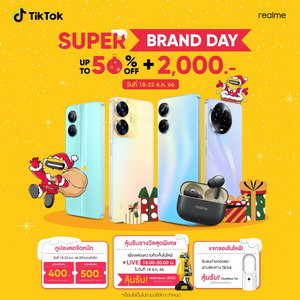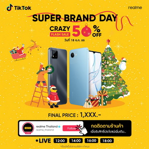 เรียลมี แบรนด์สมาร์ตโฟนที่เติบโตเร็วที่สุดในโลก จัดโปรโมชั่นส่งท้ายปี Super Brand Day ผ่านช่องทาง Tiktok realme official มอบส่วนลด 50% โดยแฟน ๆสามารถติดตามทั้งผ่านไลฟ์สดตลอดทั้งวันและนอกจากนี้ยังพบกับสินค้า Flash sale ราคาสุดพิเศษ พร้อมกับของแถมอีกมากมายตั้งแต่วันที่ 18-22 ธันวาคมเท่านั้น