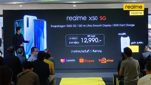 realme X50 5G เปิดราคาทางการในประเทศไทยที่ 12,990 บาท กับตัวเลือกทั้งหมด 2 สี ได้แก่ Ice Silver และ Jungle Green โดยเปิดให้สั่งจองแล้ววันนี้ ถึงวันที่ 31 กรกฎาคม และเริ่มวางจำหน่ายตั้งแต่วันที่ 1 สิงหาคมนี้เป็นต้นไป ทั้งที่ร้าน realme Brand Shop และร้านตัวแทนจำหน่ายทั่วประเทศ รวมถึงช่องทางออนไลน์ที่ Lazada, Shopee และThisshop พร้อมรับฟรีของแถมมูลค่ารวม 5,999 บาท