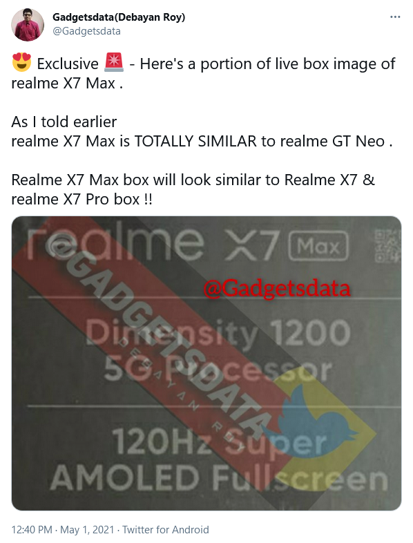 ผู้ใช้ทวิตเตอร์ @Gadgetsdata ได้โพสต์รูปถ่ายของตัวกล่องบรรจุภัณฑ์ realme X7 Max ซึ่งเผยให้เห็นสเปกตัวเครื่องบางส่วน ได้แก่ชิปเซ็ตประมวลผล MediaTek Dimensity 1200 ที่รองรับการเชื่อมต่อ 5G และหน้าจอแสดงผลแบบ Super AMOLED ที่มีอัตรารีเฟรช 120Hz