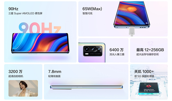 - หน้าจอแสดงผล AMOLED ขอบโค้ง ขนาด 6.55 นิ้ว ความละเอียด 2400x1080 พิกเซล (FHD+) อัตรารีเฟรชสูงสุด 90Hz, อัตรา Touch Sampling 360Hz ครอบคลุมขอบเขตสี DCI-P4 100%